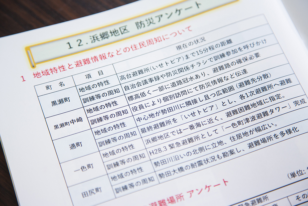 「自治」や「まちづくり」とひと口に言ってもカバーする範囲は幅広いため、何を目的に活動するのがベストなのかを考え抜いたといいます。協議会が「防災」をテーマに活動しようと決めたのには、2つの大きな背景がありました。1つは浜郷地区における災害時の被害想定が大きいこと。浜郷地区は、伊勢湾に流れ出る勢田川の下流域に位置し、地区内には五十鈴川も流れています。それゆえ南海トラフ地震などが発生した場合に、津波の被害を受ける可能性が非常に高いのだそう。さらに、集中豪雨の際には浸水も予想されています。実際、2017年の台風21号によって、地区内で浸水被害が発生したとのこと。
