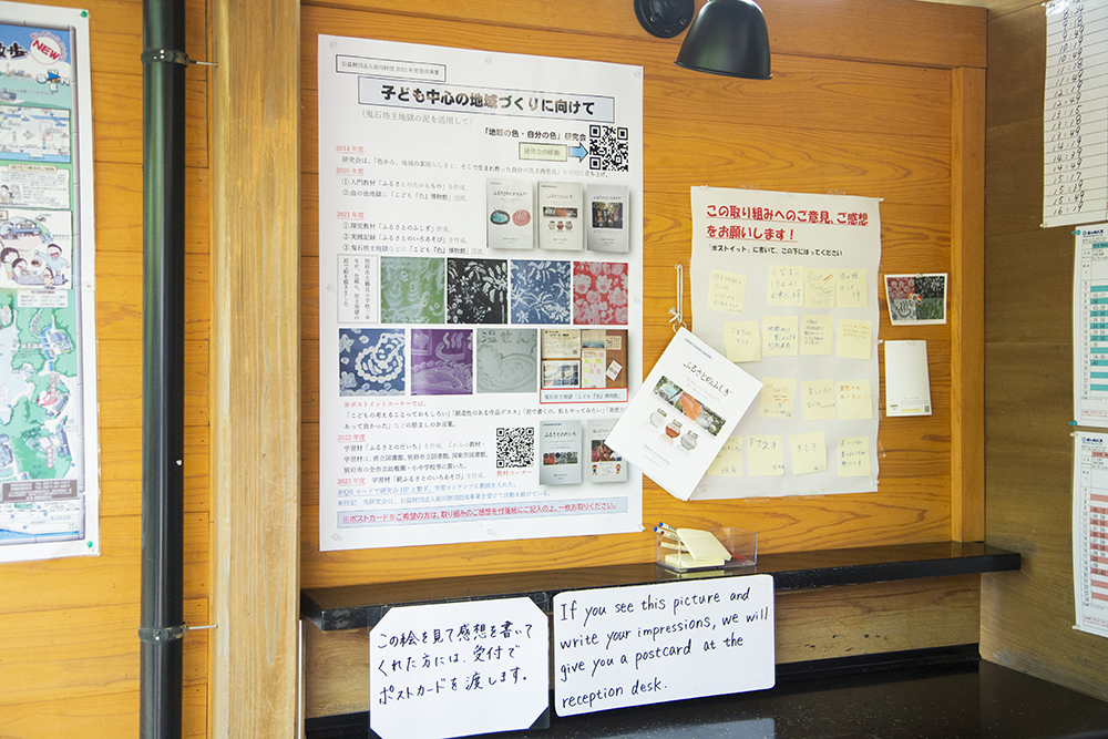 「地域の色・自分の色」研究会は、2023年6月までに授業の中で子どもたちが作った制作物を展示する「子ども色博物館」を4回に渡って開催。地獄の泥を使った絵や泥染め、七島藺のしめ縄などの展示のほか、来館者が感想を記入するポストイットコーナーも設け、450件以上の感想が寄せられてきました。