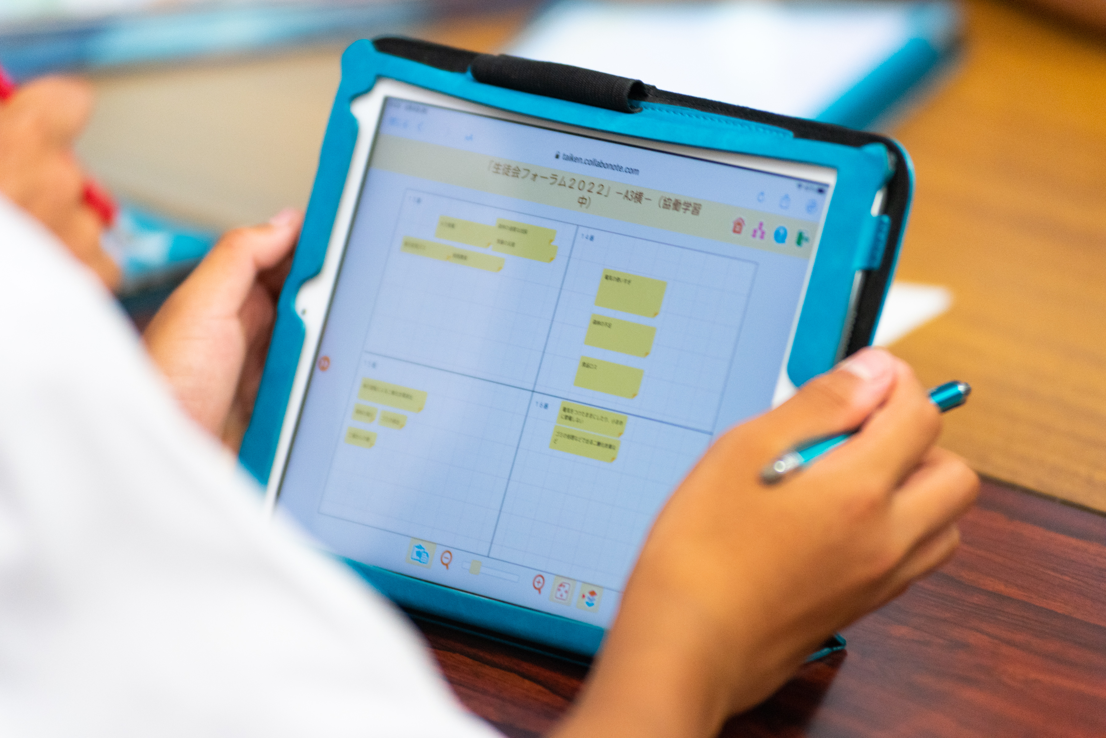 また、1人1台ずつ配られたタブレットに搭載された「コラボノート」というソリューションを使って、協働学習を実施しました。おのおのの意見をクラウド上に記載し、全員の意見をテキストマイニングして最も多く出た単語を投影し、グループの考えとしてまとめます。