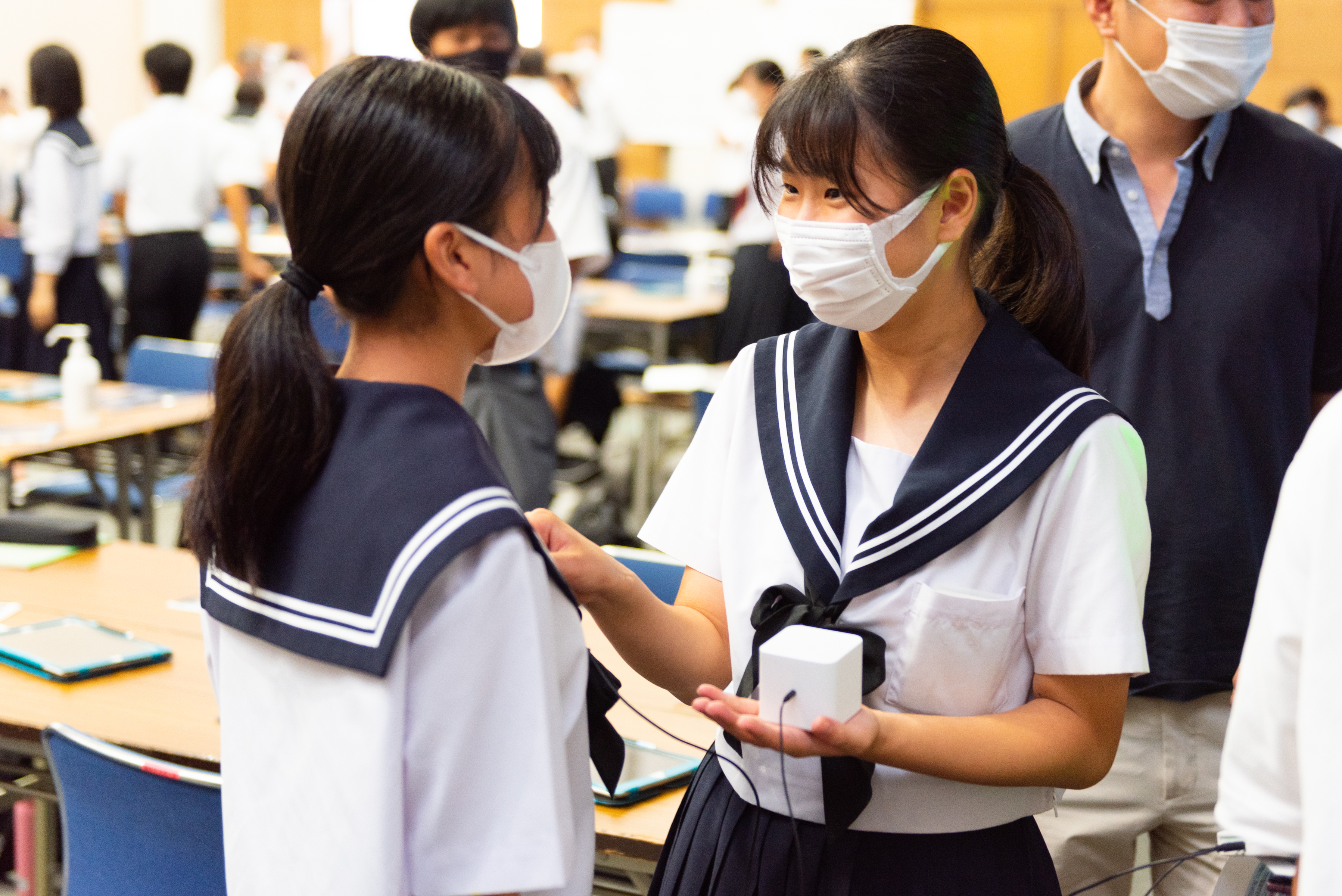 心臓ボックスの振動を通じて自分自身の鼓動を感じた中学生たちは、「私、生きてる!」、「なにこれ、不思議…!」と、体験に目を輝かせていました。友達の心臓ボックスを触って、自分の鼓動との違いを確かめるなど、互いに生命として存在している事実を再確認していました。